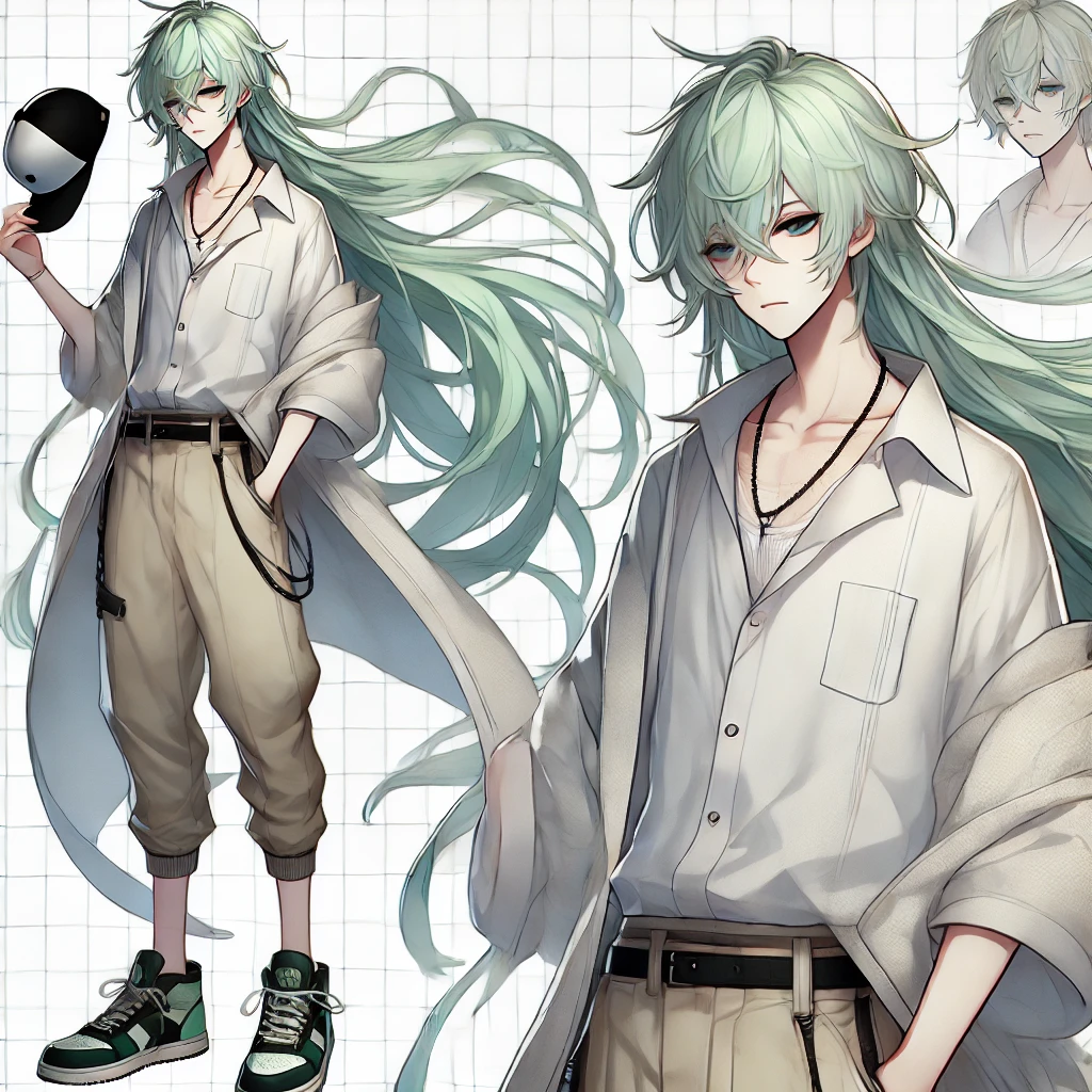 Nのデザインは、他の登場人物とは一線を画す独特なビジュアルが特徴です。まず目を引くのが、長い緑色の髪と中性的な顔立ち。そして、白いシャツにキャップをかぶったシンプルながらも洗練された服装です。これは、Nというキャラクターが「人間社会から少し距離を置いた存在」であることを表現しています。見た目からも、どこか浮世離れした印象を受けるのはそのためです。