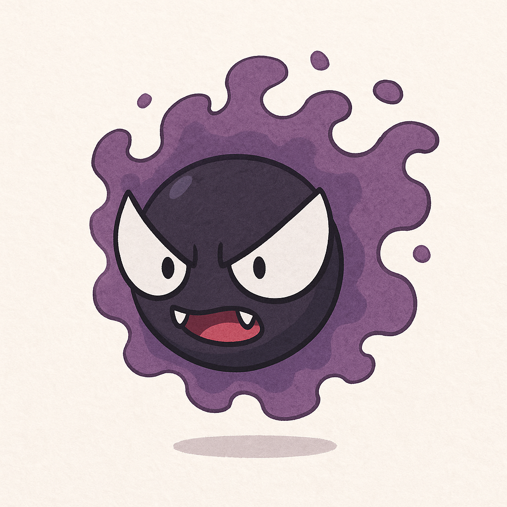 ゲンガーは、初代『ポケットモンスター 赤・緑』から登場しているゴースト・どくタイプのポケモンです。その最大の特徴は、紫色の体色と不気味な笑顔を持ちながらも、どこか愛嬌のあるビジュアルにあります。この独特な見た目は、ミステリアスな印象と親しみやすさを両立しており、長年にわたり多くのファンに支持されてきました。