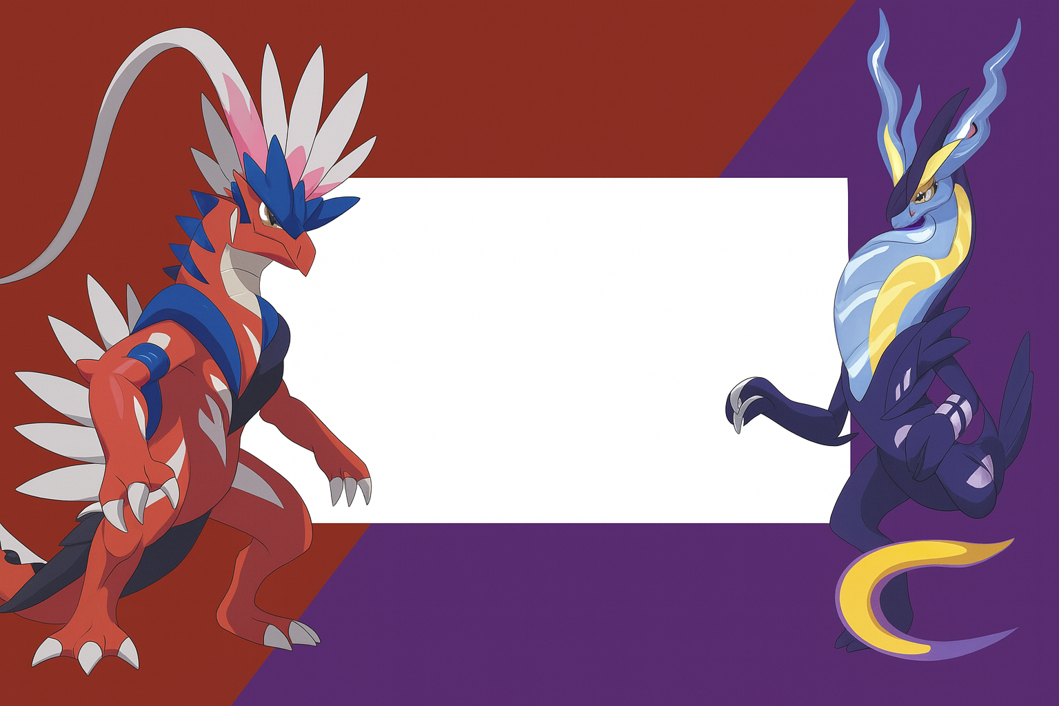 パッケージ伝説コライドン(獣脚類や恐竜を思わせる有機的な姿)ミライドン(ジェット機やバイクを思わせる機械的な姿)