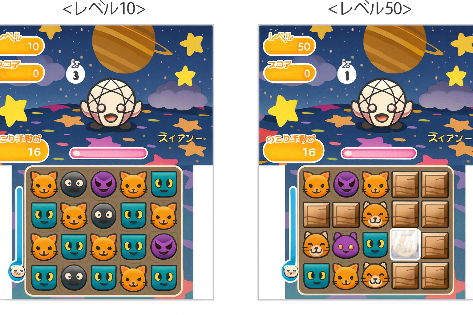 手数は16、HPは約13,000と、終盤のステージとしては標準的な数値に設定されています。注意すべきはオジャマの内容で、岩ブロックや壊せないブロックを盤面に定期的に出現させてきます。これらのオジャマを放置すると盤面が狭まり、コンボが繋がりにくくなってしまうため、迅速な処理が求められます。